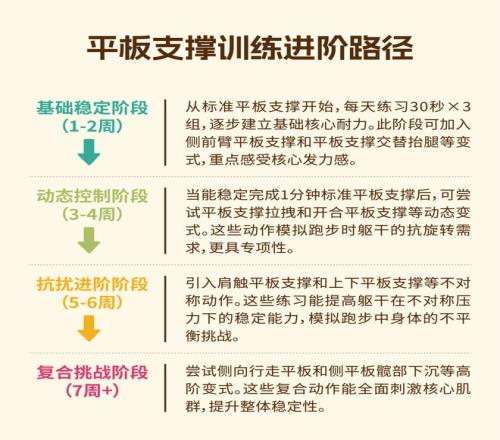 对跑者而言,平板支撑卡点挑战的价值远超普通健身爱好者。强有力的核心肌群对运动中的身体姿势起着稳定和支持作用,是上下肢协同工作的枢纽。