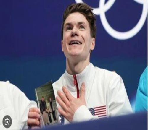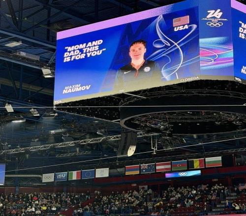 其中,最动人的一幕发生在花样滑冰赛场的“kiss and cry”区域。这一区域是运动员完成比赛后,和教练一起等待出分的地方。当时,24岁的美国选手马克西姆·瑙莫夫(Maxim Naumov)刚刚完成自己的比赛,他攥着张泛黄照片,那是父母牵着3岁的他初次滑冰的合影。