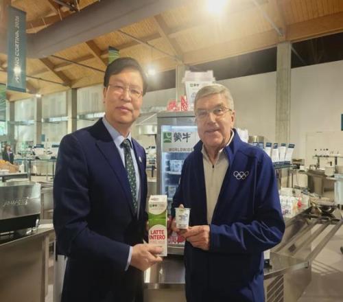 国际奥委会终身名誉主席巴赫(右)与蒙牛高级执行总裁李鹏程(左)在米兰奥运村运动员食堂