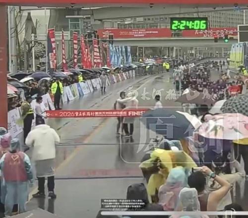 雨水模糊了视线,但不能模糊专业的底线。▲3月15日,在重庆万州举办的2026重庆万州环湖马拉松终点处,男子全程马...