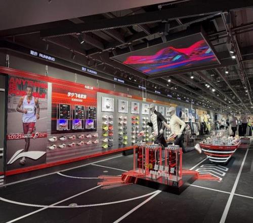 如今走进李宁品牌的门店,最先闯入视野的,往往是一整面跑鞋墙。从左至右依次是竞速比赛、进阶训练、日常慢跑、跑进山野四部分,飞电、赤兔、超轻、越影、超影、的卢等全系列李宁跑鞋产品陈列其间。