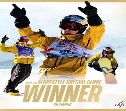 3月28日,2025-2026赛季单板滑雪世界杯瑞士锡尔瓦普拉纳站,男子坡面障碍技巧的比赛因恶劣天气最终取消,苏翊鸣斩获坡面障碍技巧水晶杯总冠军,包揽大跳台和坡面障碍两个项目的赛季总冠军。