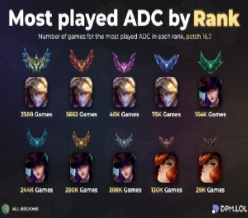 体育资讯4月17日称 数据网站DPM.LOL统计,LOL各段位出场率最高的下路AD英雄:伊泽瑞尔、女警、女枪。