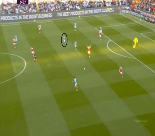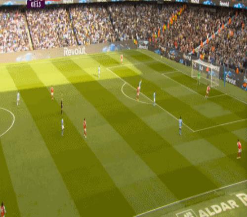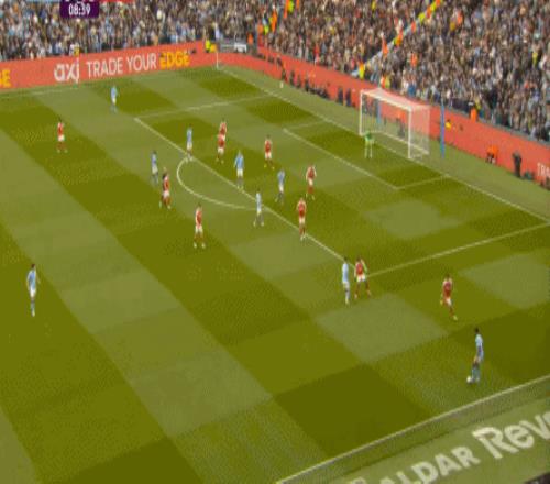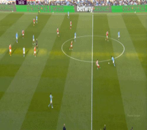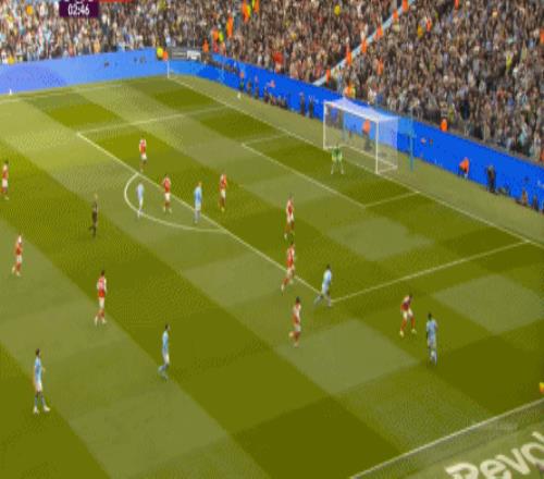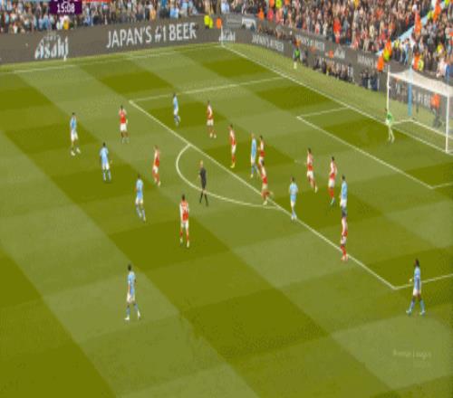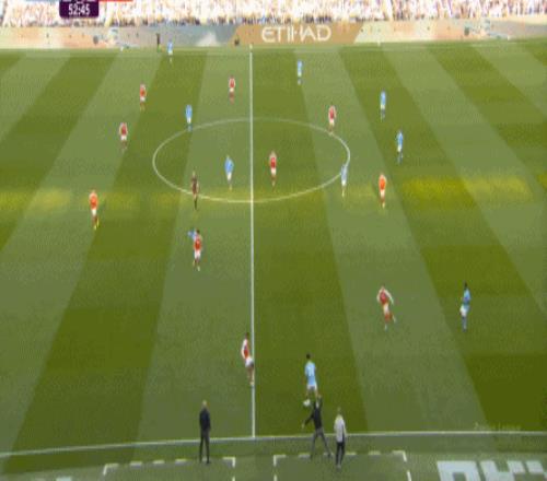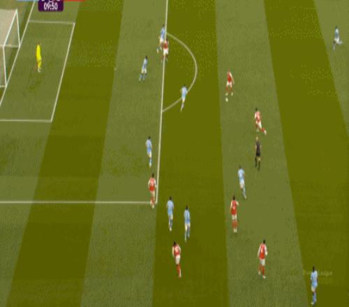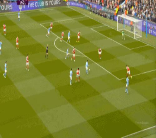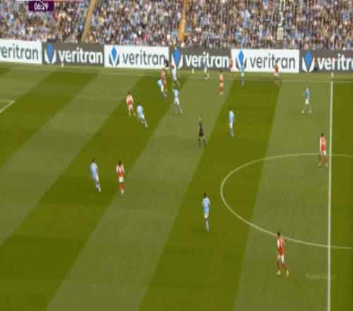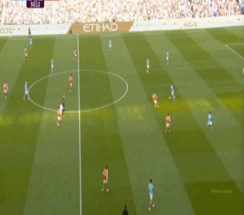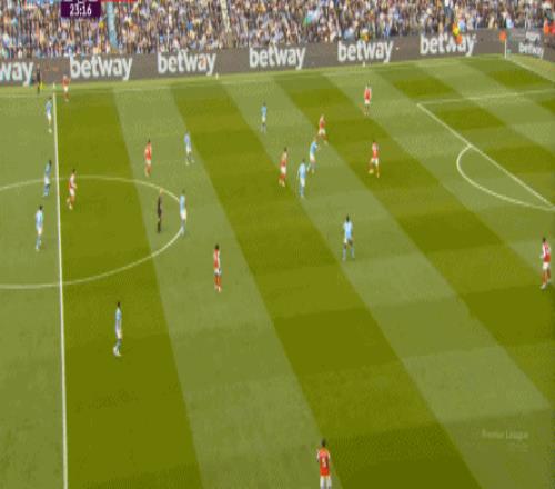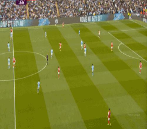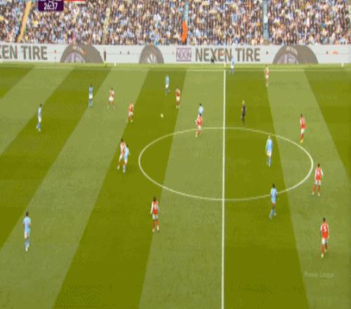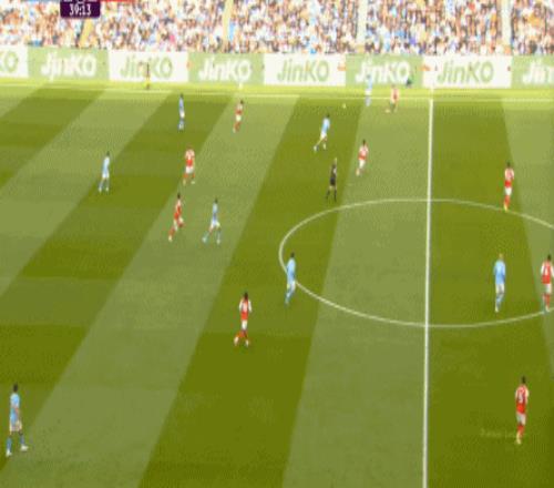 就在这次进攻之后,曼城从后场开始启动,奥赖利的一次斜向跑位绕到了马丁内利的身后,但在这个时候你也可以看到,近期赛程更为沉重的阿森纳其实已经有点脱节了,中后场球员已经不太能跟得上了: