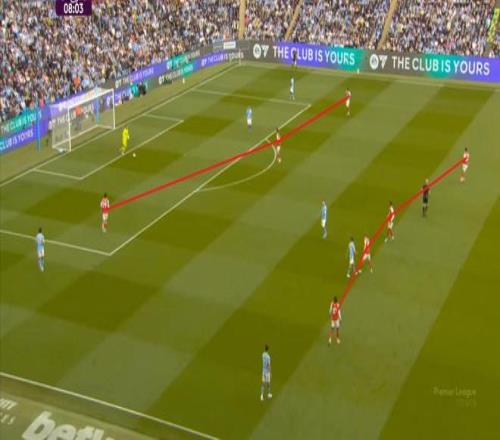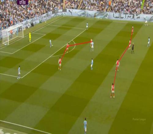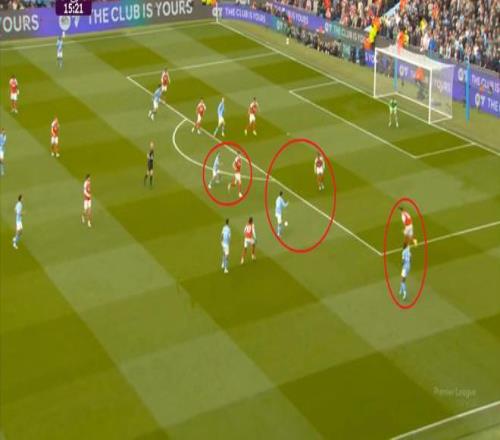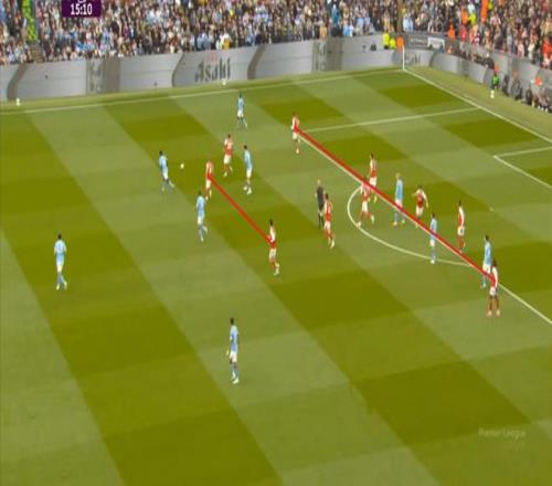 这是一个相当激进的逼抢思路,如果选用的球员在跑动、变向上稍有不足,从而给曼城露出哪怕是几度的角度或者几秒的时间,曼城就有可能层层剥茧,一步步打到阿森纳的两线之间,威胁到最后三人防守的防线。
