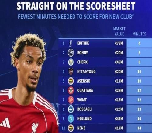 北京时间10月8日,德转统计了夏窗最快攻入新赛季首球球员,埃基蒂克以开场4分钟进球排名第一,博尼以一分钟之差排...